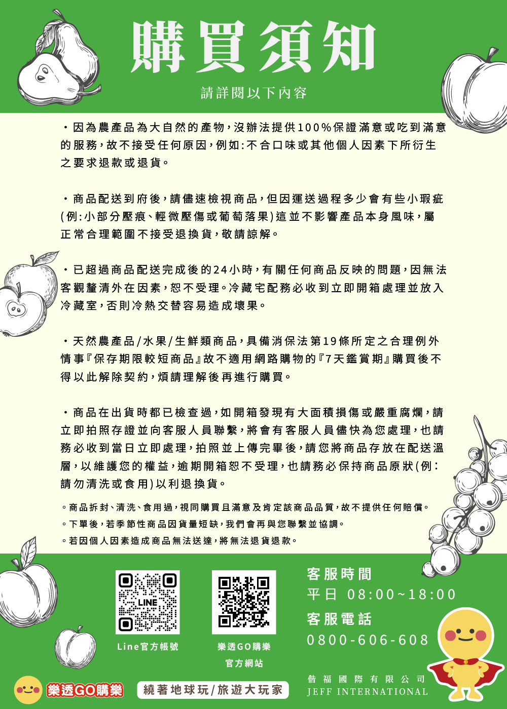 6. 天然農產品/水果/生鮮類商品,具備消保法第19條所定之合理例外情事『保存期限較短商品』,不適用於網路購物『7天猶豫期』,購買後不得於解除契約,煩請理解後再行購買。