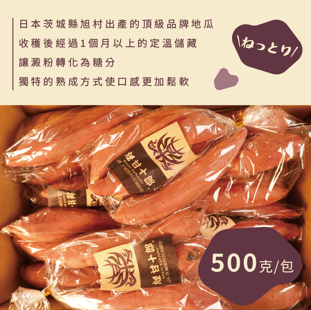 旭甘十郎的特色: 產自日本茨城縣的JA旭村,是經過嚴格挑選與品牌化的高品質地瓜。獨特熟成技術,收穫後經過1個月以上的定溫儲藏,讓澱粉轉化為糖分,使口感ねっとり(黏軟)、滋味香甜。