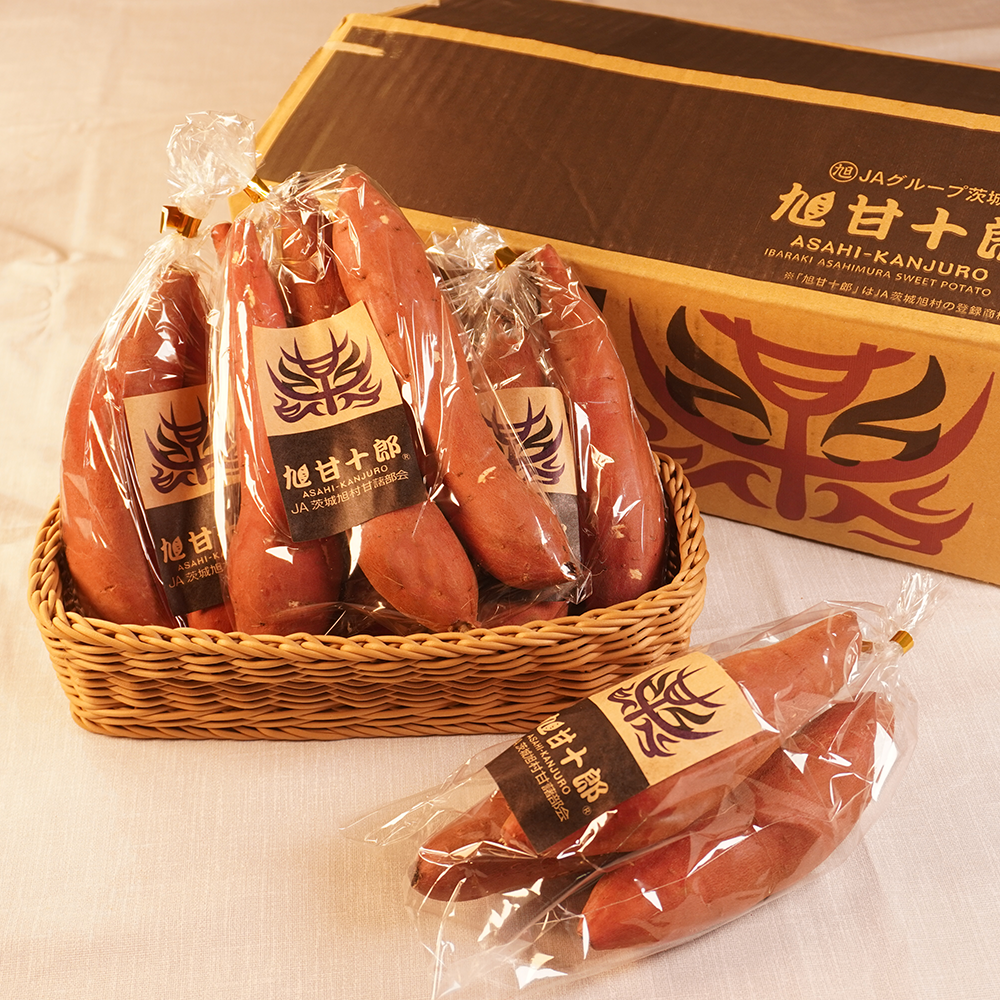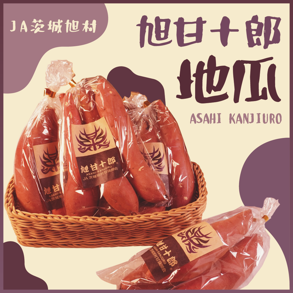「旭甘十郎」(Asahi Kanjiuro)是日本茨城縣旭村(JA茨城旭村)出產的頂級品牌地瓜(甘藷),以其極高的糖度、黏軟的「蜜芋」口感和長達1個月以上的定溫熟成聞名。主要品種包括紅春香(紅はるか)與Silk Sweet(シルクスイート),是高品質的燒烤地瓜首選。 旭甘十郎在市場上享有高評價,常作為高品質的禮品或高級食材販售。
